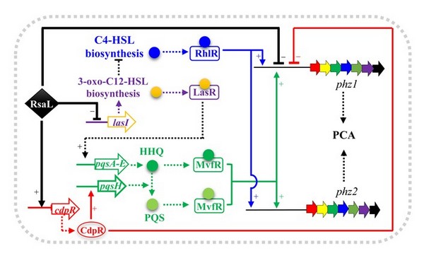 何亚文研究团队长期致力于申嗪霉素生物合成调控机制的研究。申嗪霉素产生菌包含两个高度同源的合成基因簇phzA1B1C1D1E1F1G1(以下简称phz1)和phzA2B2C2D2E2F2G2(以下简称phz2),负责PCA的生物合成。通过基因敲除、构建转录融合报告菌株及 RNA-Seq 分析等手段,研究团队阐明了3类群体感应系统调控申嗪霉素生物合成的分子机制(Scientific Reports,2016,6:30352); 在此基础上,进一步发现转录调控因子RsaL强烈抑制PCA生物合成。通过系统分析RsaL对PCA合成、phz1和phz2表达、群体感应信号分子合成酶基因表达的影响,发现RsaL通过多条途径调控PCA的生物合成:(1)RsaL直接结合在phz1的启动子区域负调控phz1表达;(2)RsaL负调控las和pqs群体感应系统以及正调控rhl系统,间接调控phz1和phz2基因簇的表达;(3)RsaL正调控转录因子cdpR表达,CdpR负调控phz1表达,进而抑制申嗪霉素的生物合成。
