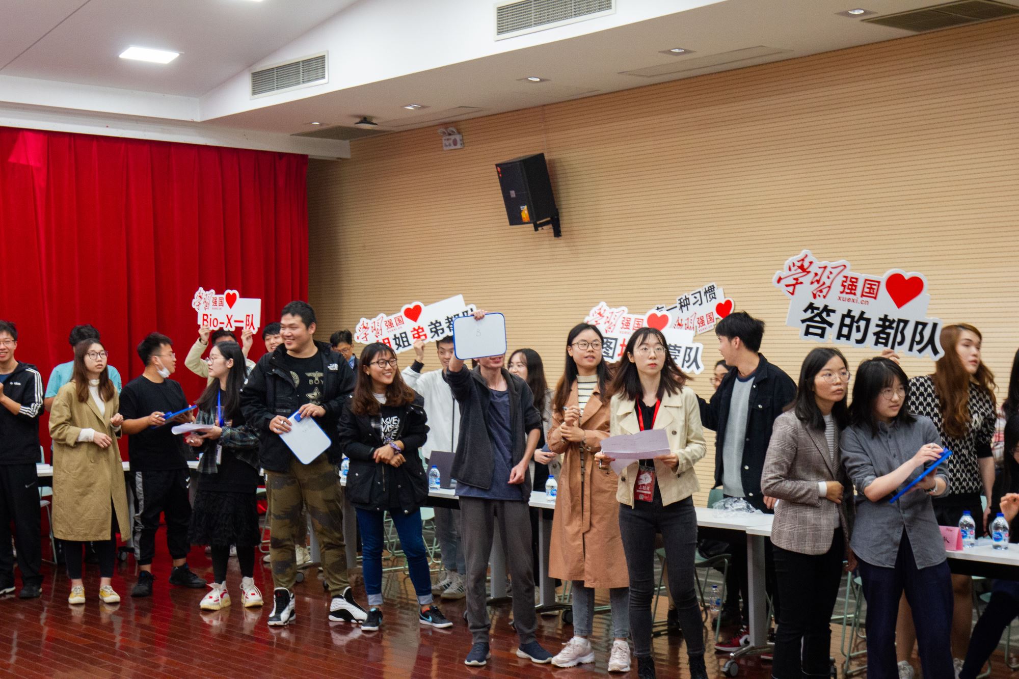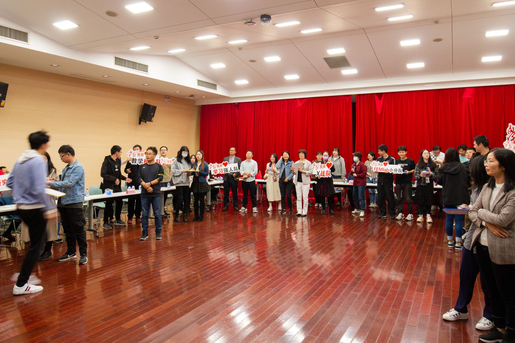 此次“学习强国”知识竞赛共有12支队伍自主参赛,比赛包括必答题环节、抢答题环节和限时答题环节,主要考验队员知识储备量、现场反应能力和团队作战能力。赛前,各队队员精神饱满、斗志昂扬地进行队伍风采展示;必答题环节,每组派出两名队员参赛,强大的知识储备保证了各队伍较高的答题正确率;抢答题环节将整个活动推向高潮,参赛队员热情高涨,每组都拼出最快的手速争抢答题机会,现场比分变幻莫测、扣人心弦,完美的作答、精彩的比拼令现场掌声不断、高潮迭起、精彩纷呈; 接下来限时答题环节,队员通过“学习强国”平台的挑战答题版块答题作战,既发挥个人才智,又展现出团队合作精神。
