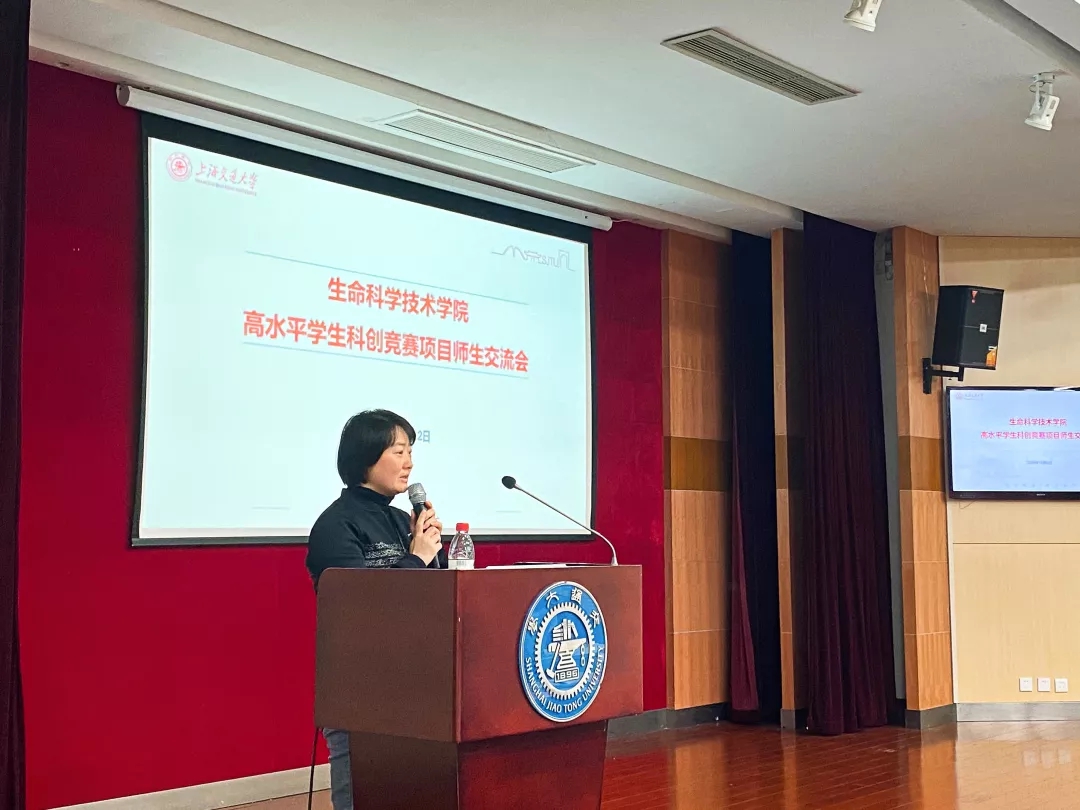七位教师和项目负责人分别向同学们介绍了自己指导的高水平学生科技创新竞赛项目,包括许杰《利用植物瞬时表达系统高效生产肿瘤特异性抗体的探究》,韦朝春介绍iGEM 竞赛以及软件队 SJTU-software,倪俊《光驱动合成生物学》,肖晗《蘑菇真菌源重要化合物的高效生产》,李丹课题组《冠状病毒蛋白相分离引发神经退行性疾病的探究》,陈海峰课题组《蛋白质设计:站在蛋白质科学新时代的交叉口》以及秦胜营课题组《基因调控区差异甲基化在精神分裂症中的功能机制研究》七个项目。