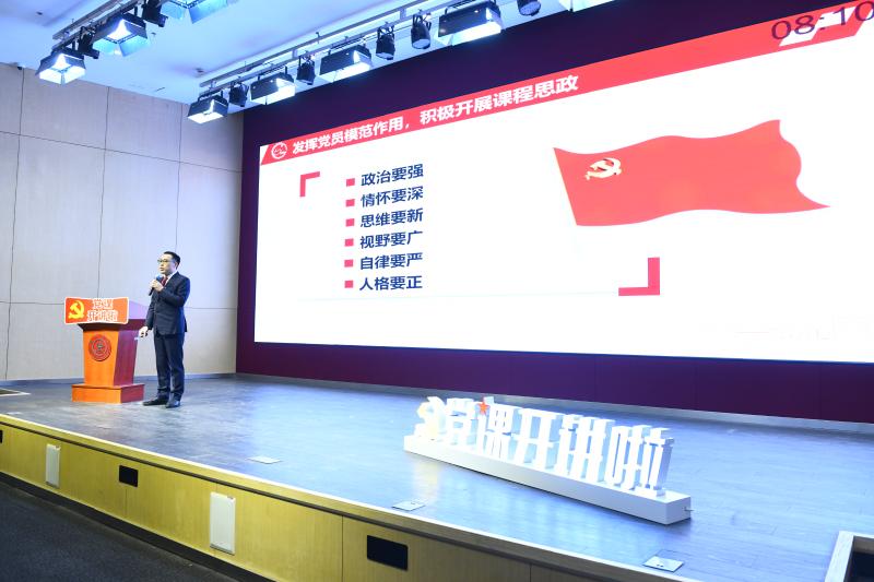 最后,陈海峰分享了自己开展课程思政的感悟。开展课程思政,每位大学老师,特别是党员教师都义不容辞。他号召党员们聚焦课程思政,在专业课的教学环节融入课程思政,做到润物无声,实现“价值引领、知识探究、能力建设、人格养成”四位一体的人才培养理念,让党旗在课程思政的课堂高高飘扬,以实际行动迎接建党一百周年。