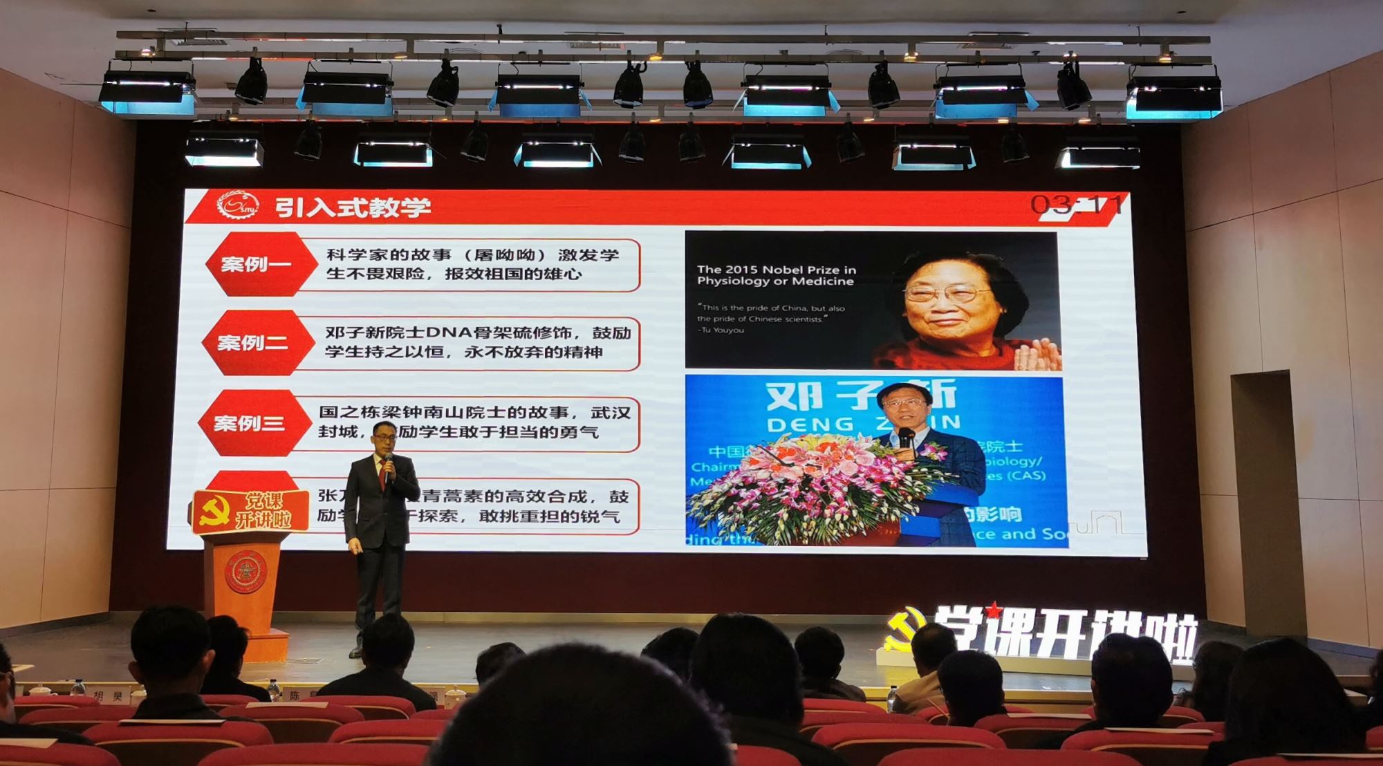 在支部党员石婷给大一本科生讲授的《自然科学基础》课上,她介绍了中国第一位诺贝尔生理医学奖获得者屠呦呦在中草药中发现能够治疗疟疾的青蒿素,挽救了数千万人的生命的故事,激发学生不畏艰险、报效祖国的雄心;在介绍微生物世界时,引入邓子新院士团队十几年如一日的坚持,最终发现DNA骨架硫修饰的故事,鼓励学生持之以恒,永不放弃;在介绍新冠病毒的转播规律时,适时引入国之栋梁钟南山院士的故事,鼓励学生勇于奉献、敢于担当……通过课程思政引导学生追求真理,用科学家的人格魅力影响青年学子立志报效祖国。
