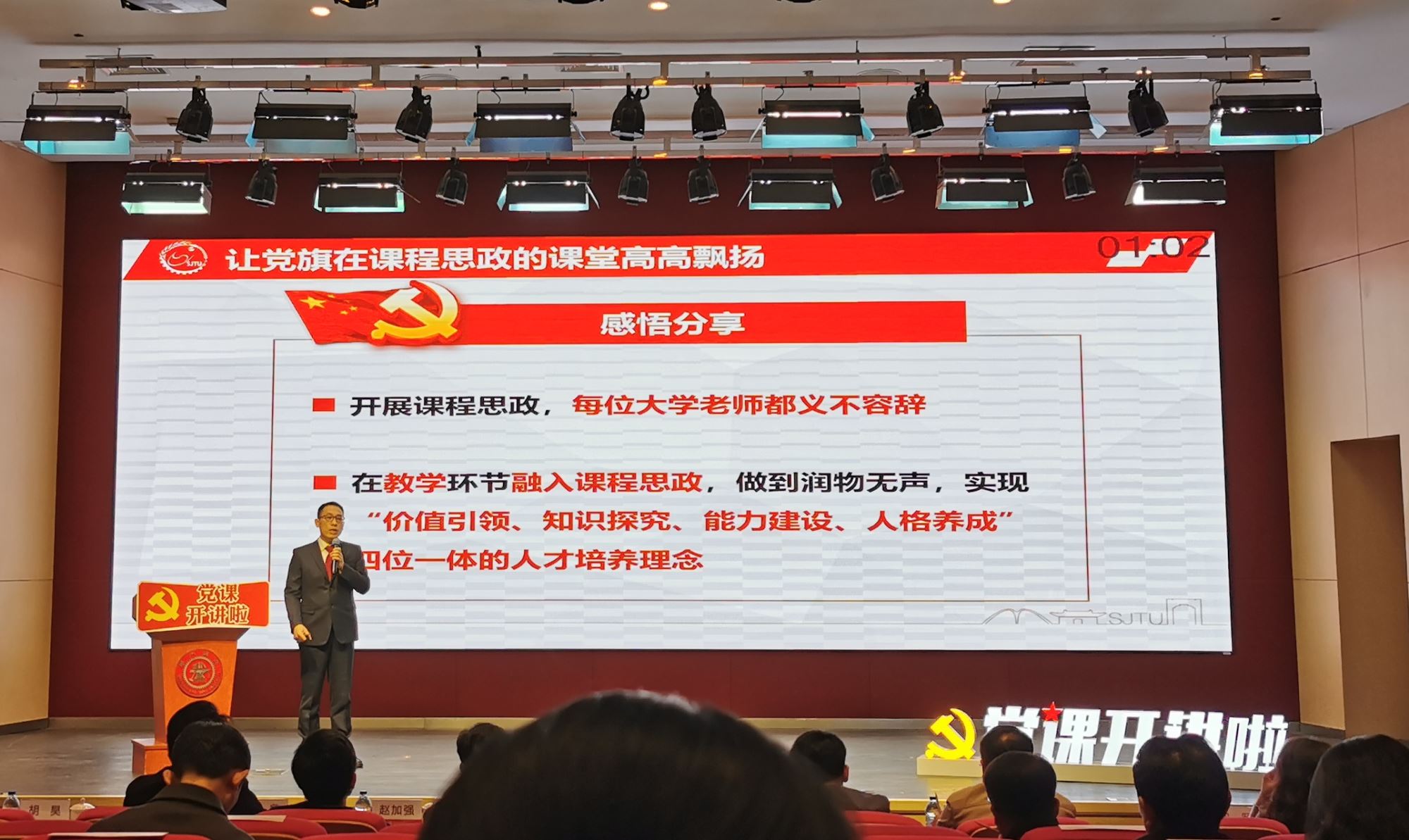 陈海峰倡议党员教师要发挥模范作用,旗帜鲜明地响应习总书记的号召,做到“政治要强,情怀要深,思维要新,视野要广,自律要严,人格要正”,让各门课程都“守好一段渠,种好责任田”,做到门门课程有思政,教师人人讲立德树人。