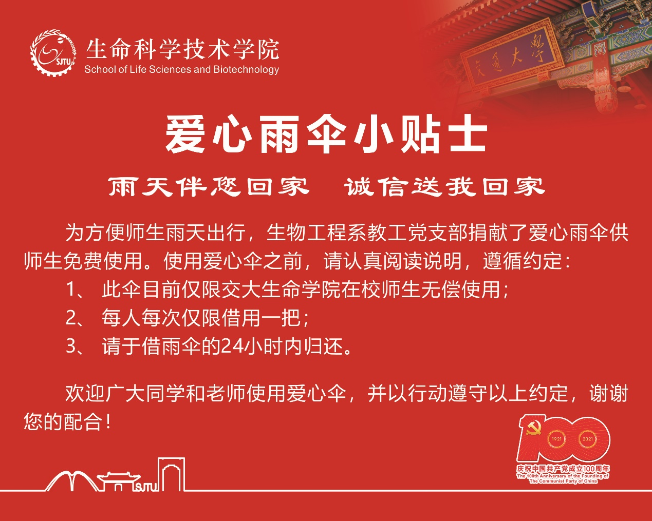 上海是一个多雨的城市,据统计,每年的下雨天数超过120天。为了方便学院师生雨天出行,本着“我为群众办实事”的宗旨,生工系教工党支部开展了“学党史,办实事,践初心”主题党日活动,动员支部全体党员每人捐款21元,在生科院大厅设置“爱心伞”取用点,以实际行动庆祝伟大的中国共产党建党一百周年。为了使爱心伞更具学院特色,支部党员踊跃提出创意和构思,在每一把伞上印制了学院院徽和建党一百周年纪念标识,并在伞架上张贴了美观又醒目的借用“小贴士”。