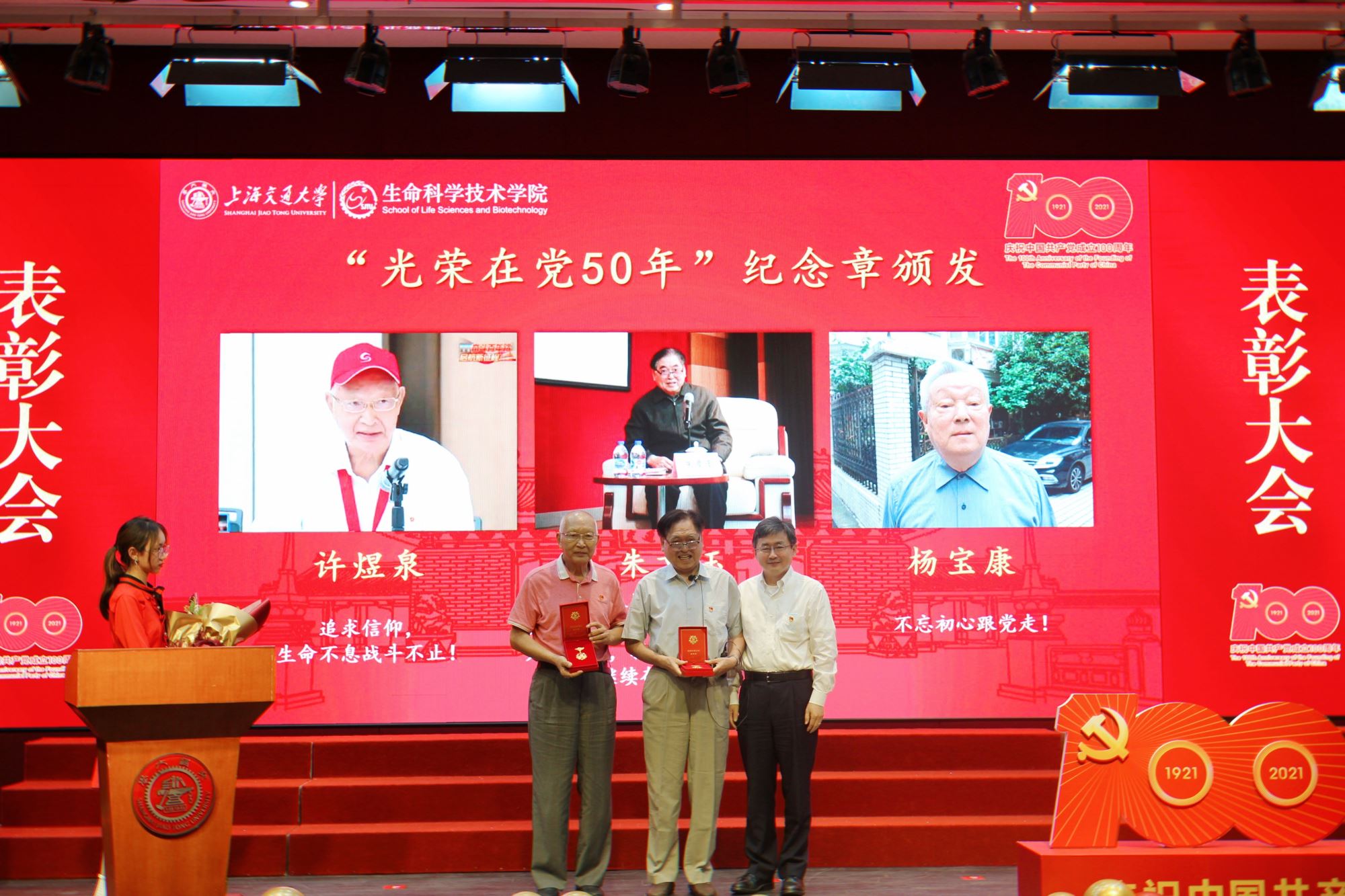 “光荣在党50年”纪念章是党中央2021年首次颁发的纪念章,体现了以习近平同志为核心的党中央对老党员的关心、关怀和褒扬,也极大地增强了老党员乃至全体党员的荣誉感、归属感、使命感。朱章玉、许煜泉和杨宝康三位老同志荣获“光荣在党50年”纪念章,丁奎岭为获奖代表朱章玉、许煜泉颁发纪念章。他们兢兢业业、默默奉献,用实际行动诠释了对共产主义的坚定信念,诠释了对党和人民的绝对忠诚,为新时代的党员同志树立了学习榜样。