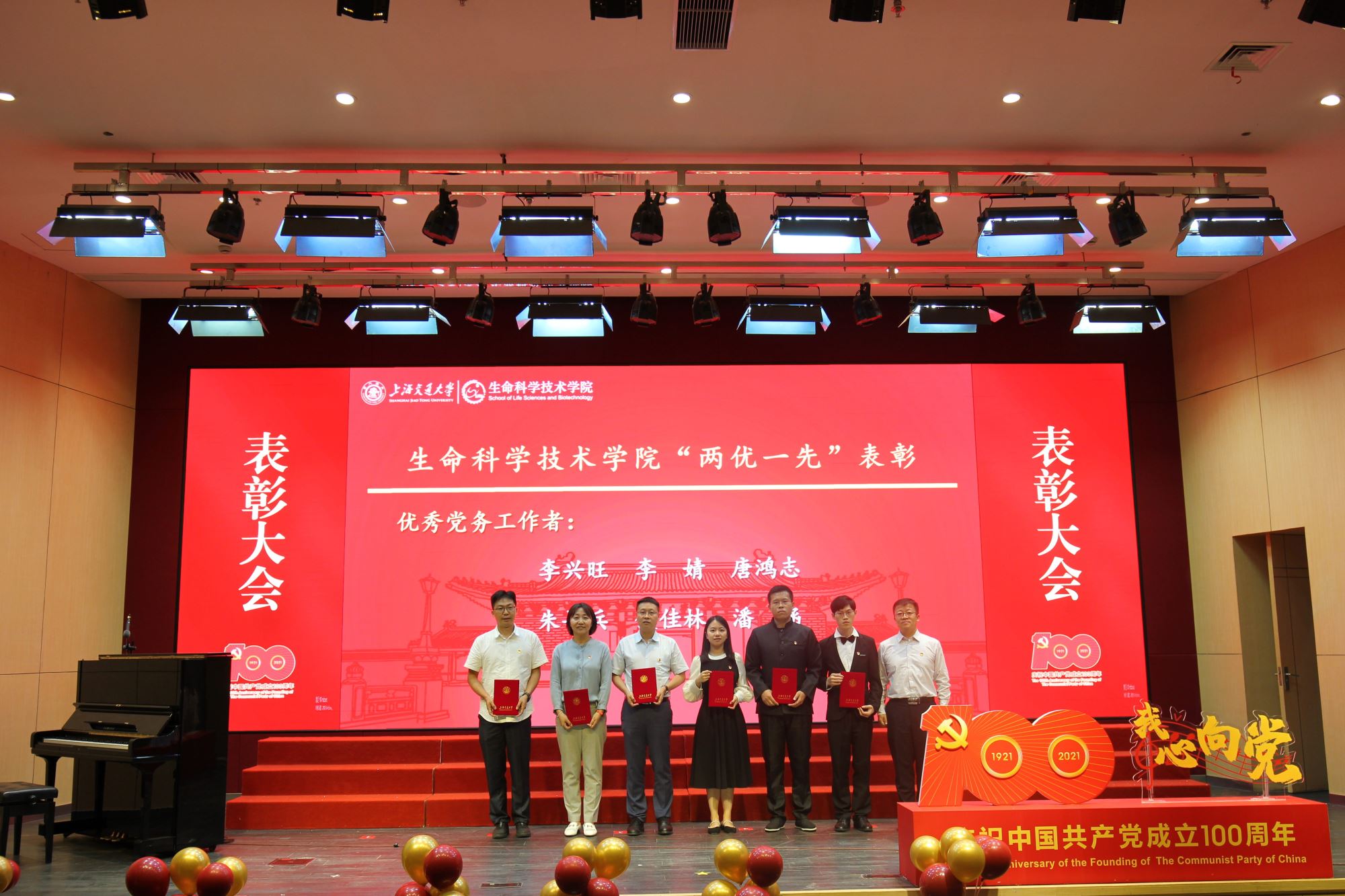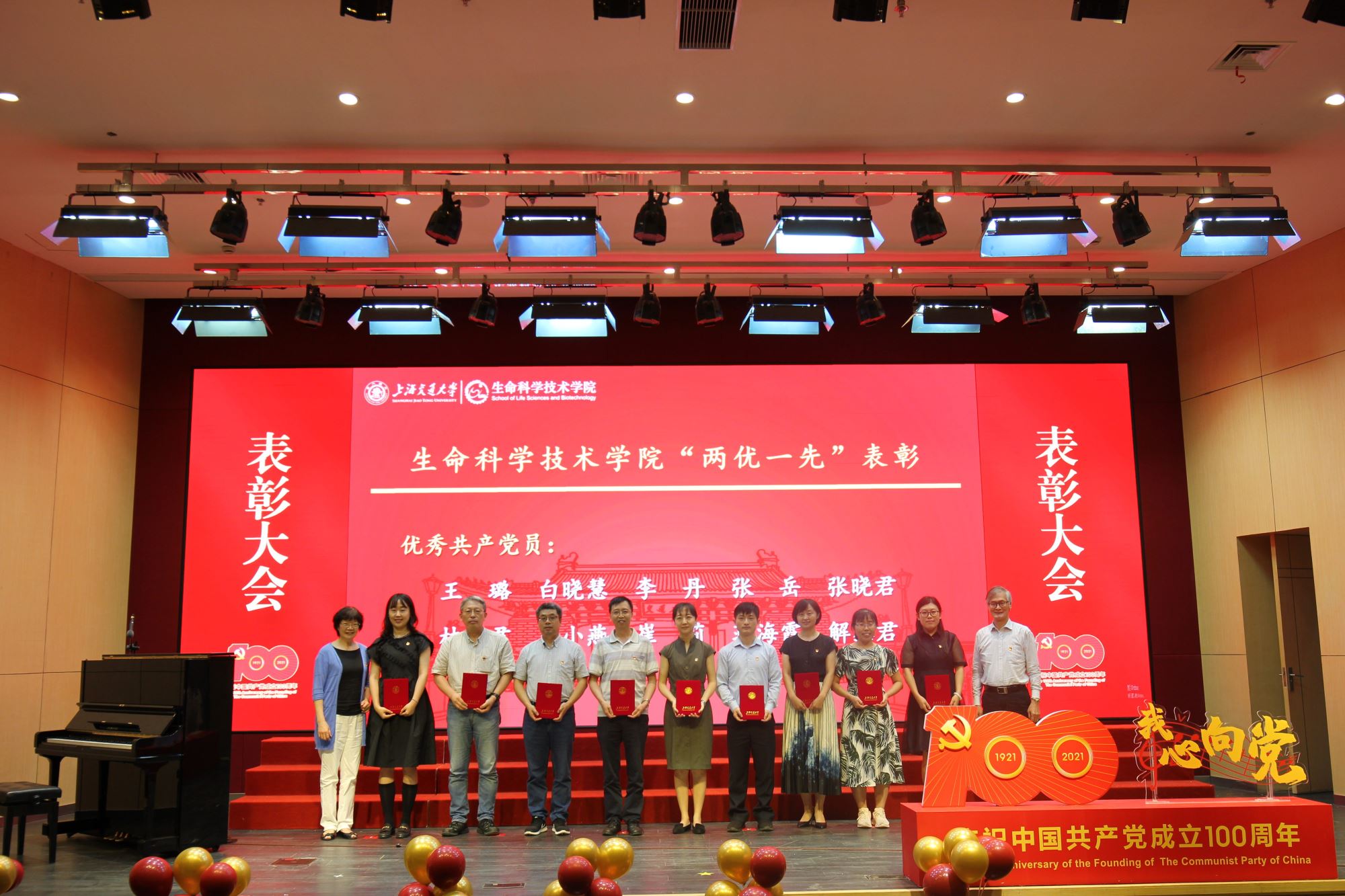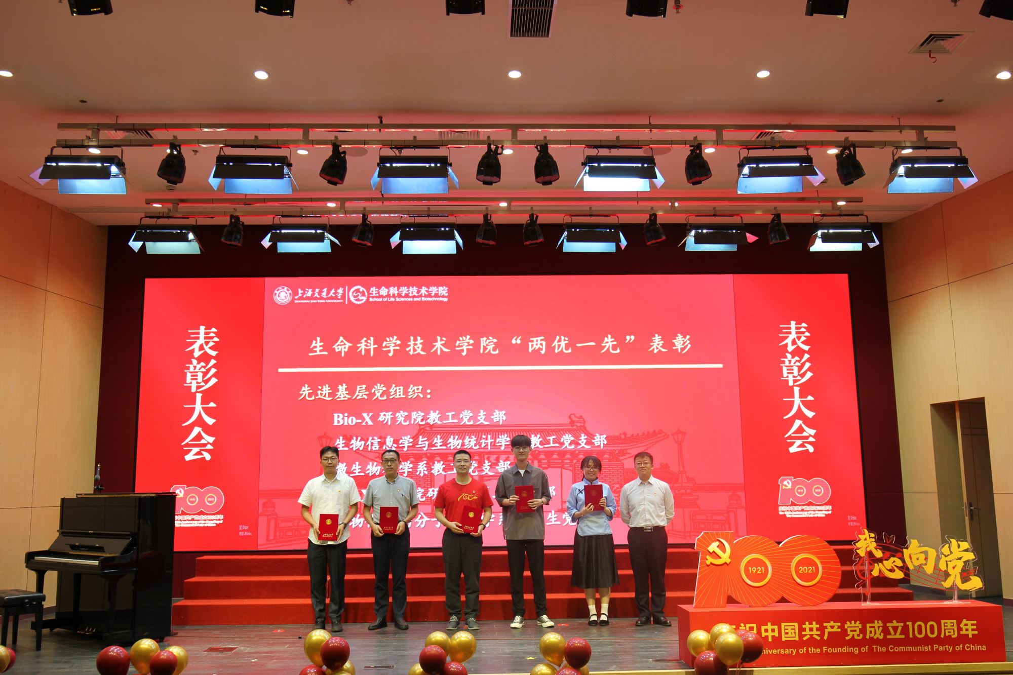 随着师生歌会演出结束,表彰大会环节在热烈而隆重气氛中拉开帷幕。大会表彰了白晓慧、王璐等30名学院优秀共产党员,李兴旺、李婧等6名优秀党务工作者,以及Bio-X 研究院教工党支部、生物信息学与生物统计学系教工党支部、微生物科学系教工党支部、Bio-X研究院研究生第二党支部、生物化学与分子生物学系研究生党支部5个先进基层党组织。