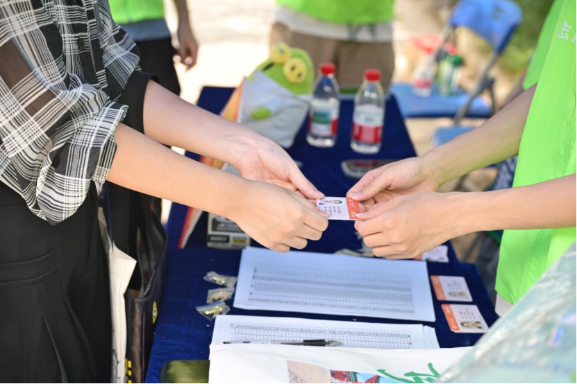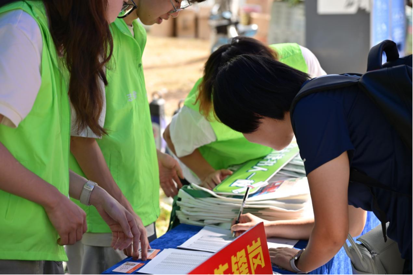 报到志愿者给新同学们耐心讲解报到流程和注册须知,并为新同学发放证件。